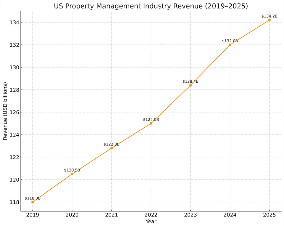 • Industry revenue (US): Industry revenue climbed modestly through 2025 (IBISWorld shows mid-single-digit growth to roughly $134B for the property-management sector in 2025). IBISWorld