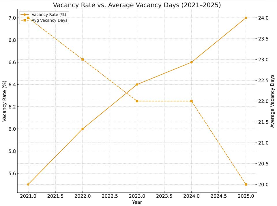 • Vacancy / turn times: Average vacancy days and unit turn metrics improved slightly in 2025 in many datasets (example: DoorLoop reports average vacancy days around ~20 days in 2025). DoorLoop